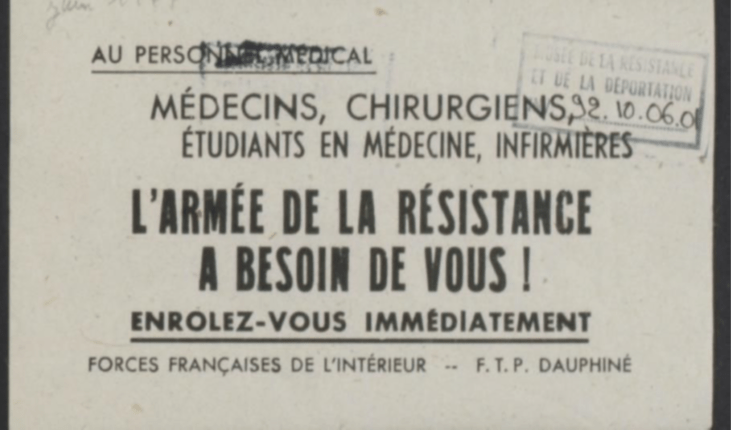 Source: Tract appelant les soignants à rejoindre la Résistance, 1944 environ, fonds FTPF de l’Isère, Musée de la Résistance et de la Déportation – Département de l’Isère