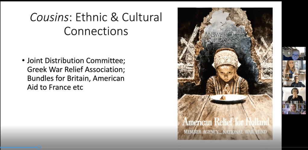 Our invited speakers gave us much to think about. First, Elisabeth Piller (Albert-Ludwigs-Universität Freiburg) presented “GIs, Cousins and Correspondents: How Americans Learned of European Hunger in the Era of the World Wars” which is part of her new book project on US Aid after the Second World War. In this paper, she examined how Americans learnt about European needs and traced different channels of information: the news media correspondents; the network of ethnic and cultural connections that Americans had throughout Europe (what she called “cousins”); and the military, which, once in Europe, provided authentic eyewitness accounts. Although it was not her main point today, Elisabeth reminded us that churches also played a major part in the process. Starting from channels of information allowed Elisabeth to draw the resulting mental maps and mental gaps within American society – and to show that the way the US addressed humanitarian crises overseas was shaped by the information they received and how they received it. To conclude, Elisabeth underlined how important it is to place World War Two in a wider perspective – but questioned whether the 1931-1953 periodization is the most appropriate to her research. She suggested instead to think more broadly about the Era of the Two World Wars, i.e. the period from (maybe) 1912 to 1953. She also reminded the audience of the importance of sources of information and their influence on perceptions of humanitarian emergencies. For Elisabeth, we need to take into consideration ethnic channels and the ways in which affect, intimacy and partisanship helped construct notions of beneficiary need and deservingness. Crucially, she set an agenda for rethinking the role of donors at home and what it meant to them as Americans to give. We will draw on Elisabeth’s insights in our next session on ‘Hegemonic Humanitarian Aid? Rethinking American Humanitarianism’ on 22 February 2022 [link to the program].