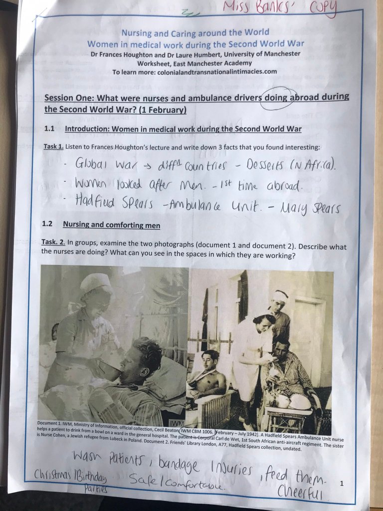 In February 2021, Frances Houghton and Laure Humbert organised three online workshops for Year 8 students from East Manchester Academy to learn about nursing in a global context during the Second World War. Students were introduced to the work of the International Hadfield Spears Ambulance Unit, and learned about the work of medical women, including nurses and ambulance drivers in the Middle East and Africa. They also learned about the work of orderlies from what was then called French Equatorial Africa in this unit, and discussed topics relating to histories of race, gender, and emotions in wartime Allied medicine. Through a mixture of mini lectures, worksheets, and classroom-based learning activities, these workshops were aimed at developing students’ confidence and skills in analysing oral, film, and written primary sources and introducing them to history at university. Students demonstrated their engagement with the topics in all three workshops by writing a postcard ‘home’ from the desert, in which they were asked to imagine that they were either a nurse or an ambulance driver writing to a loved one.