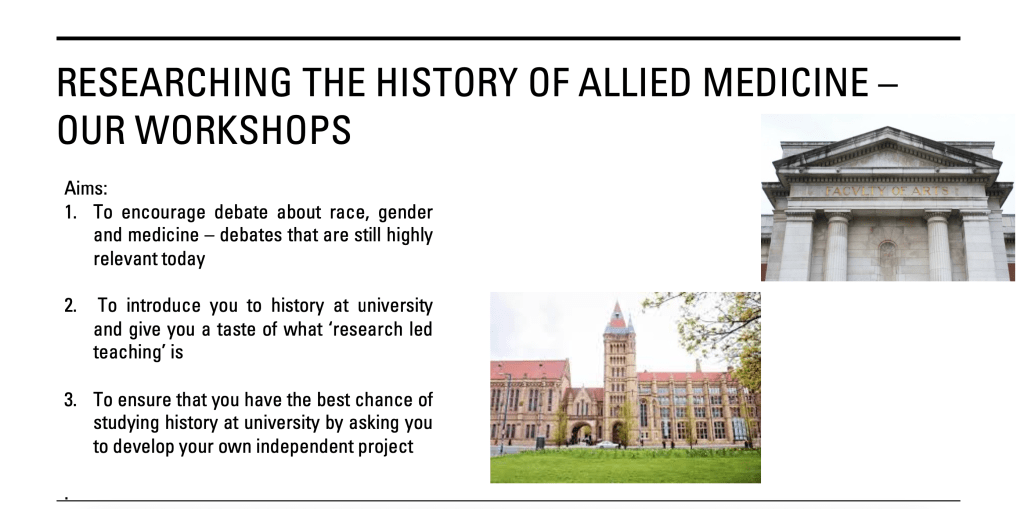 In April, Laure Humbert and Frances Houghton are starting a series of five workshops for GSCE students from Cedar Mount Academy on ‘Allied Medicine and the Second World War’. The three aims of these workshops are to (a) enhance students’ knowledge and understanding of the global nature of the war, (b) encourage debate and critical enquiry around race, gender and medicine and (c) introduce students to history at university, by giving a taste of research-led teaching. Through a mixture of short lectures, worksheet activities and independent research, students will be encouraged to think about the ways in which war medicine shaped and consolidated ideas about gender and racial differences. They will also be prompted to reflect on how broad issues of mental health were experienced and medically diagnosed in the Royal Navy during the Second World War.